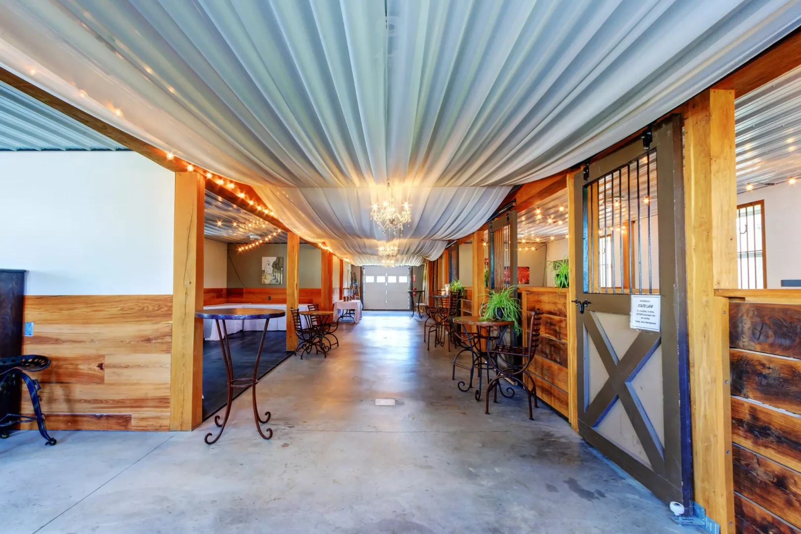 The space is defined on either end with fully opening doors to allow for an easy transition between indoors and the beautiful setting outdoors. There are also three re-purposed horse stalls made from reclaimed white oak. One of these stalls houses the bar, the other two stalls are perfect for your gift table, picture booth or for you to use as a seating area for your guests. Strung with café lighting, draping and chandeliers, the lower level is a simple, but elegant, backdrop for your reception. It is easily adaptable to add your own decorating elements and is a lovely choice for your special day.